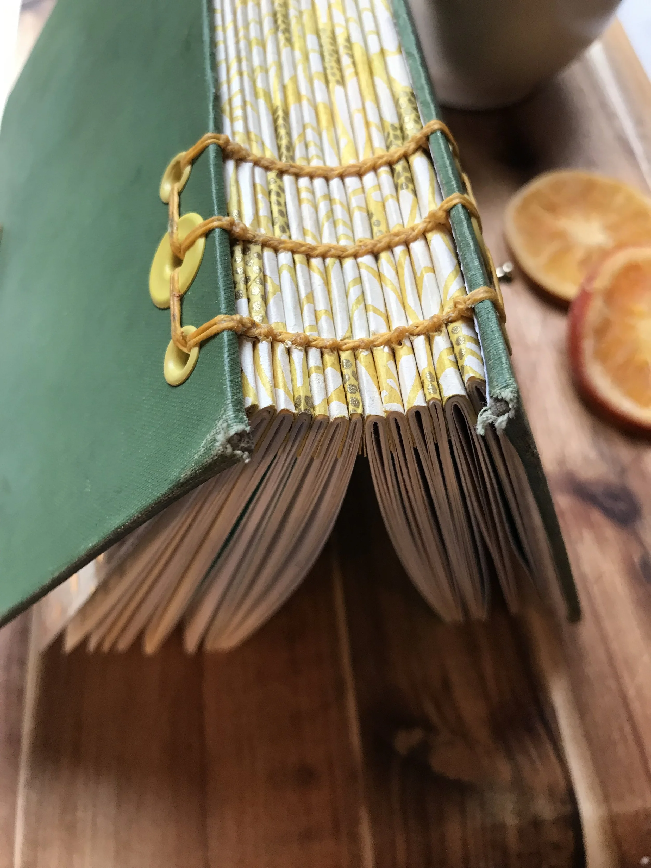 If you’ve ever had the pleasure of interacting with Tim and Sandra, then you know that their romance is out of a vintage novel. They are also some of the kindest, most gentle, sunniest people I know. I wanted this journal to emulate their sunny disposition and also emulate my blessing towards their first year of marriage; full of joy, continued romance, and hope. I used a bright yellow floral paper that I incorporated into the siding and accented with golden yellow eyelets and Irish waxed linen thread.